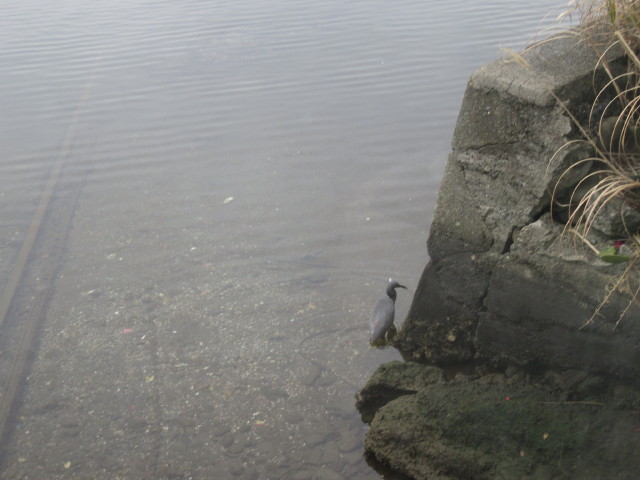最近アオサギばかりでゴイサギを見なくなったと話していたら、ちょっと小型のサギ発見! クロサギですかね?