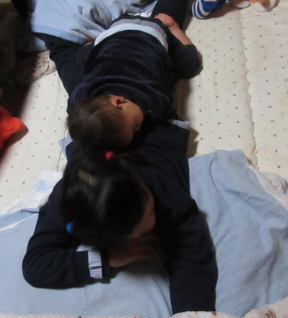 体調不良で保育園早引きのチビ1歳児の子守を小2にさせて、ほったらかしだったので見に行ってみたら、チビが背中で眠ってしまったので、ずーっとこの体制で我慢していたとのこと(笑)