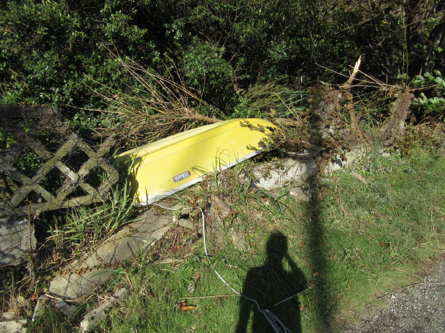 このボートが海岸から飛んで来ました。(私の車にぶつかってからこの道路へ)(-_-;)ちなみに、博人は昨夜、油断したところにブローくらって桟橋の渡り板から飛ばされ海へ落ちました。ここへ来てから初めてのことかも知れません。幸い潮が低く長靴の中もぬれずにすみましたが、やはり風力が違います。今は吹き返しが続いています。