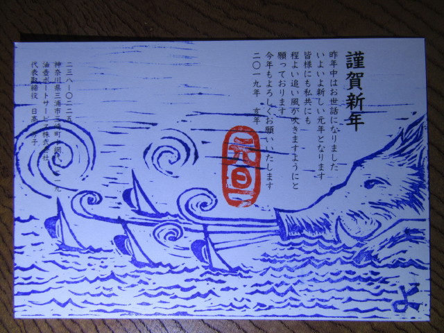 小学校5年生の時に工作の授業でゴム版画を作ったら母が会社の年賀状に採用してくれました。それから数十年、間で数回さぼったものの、毎年手彫り手刷りで頑張っております。海にちなんだ絵にするのが一番大変なのがイノシシ!手刷りなもので、あまり綺麗に刷れていないものもあったかと思います。すいません。